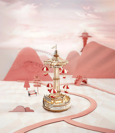 - Powered by three AAA batteries, watch the Parachute Tower come to life with lights, carnival music, and parachutes that rise and fall!
