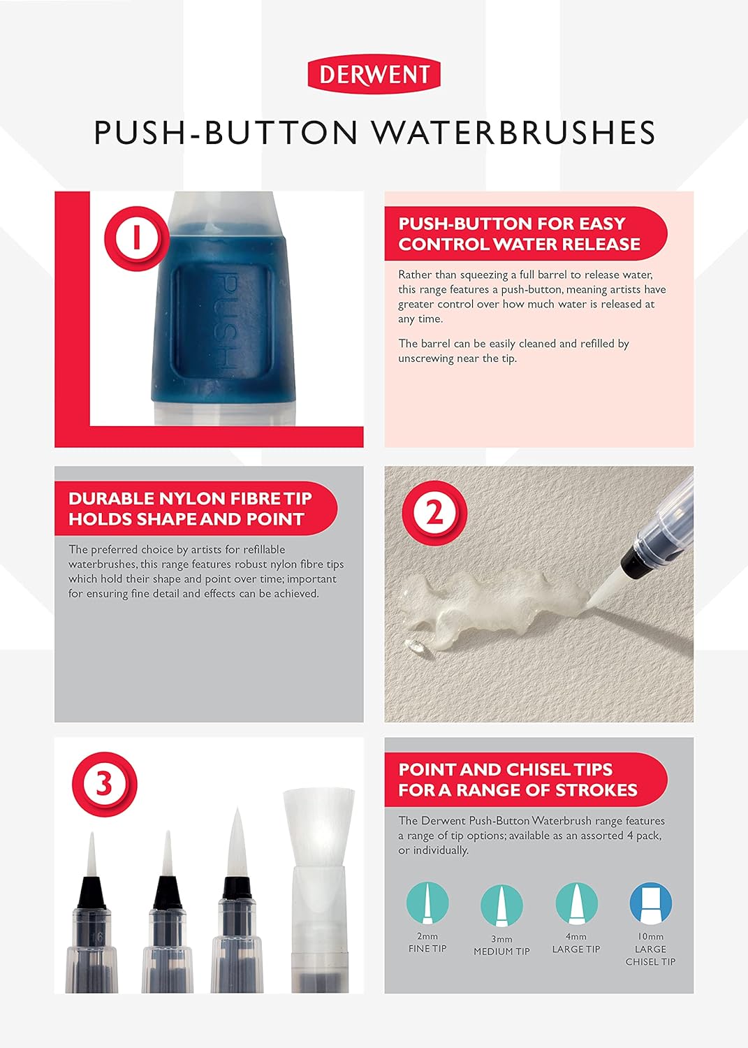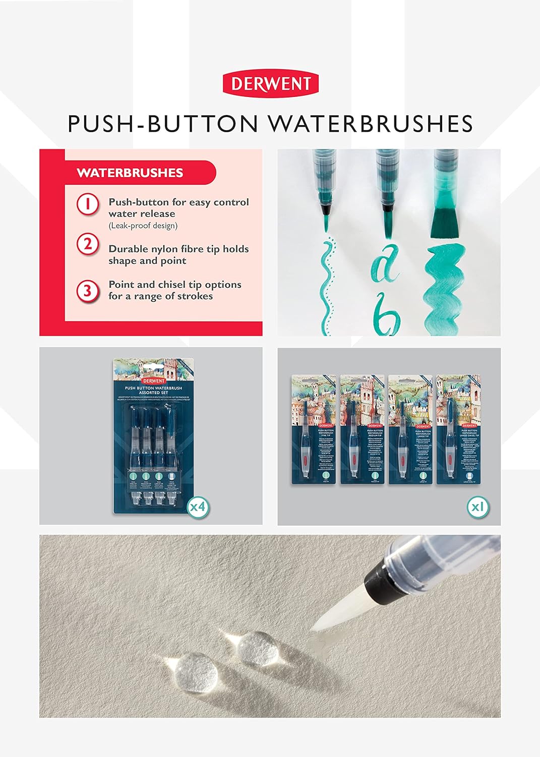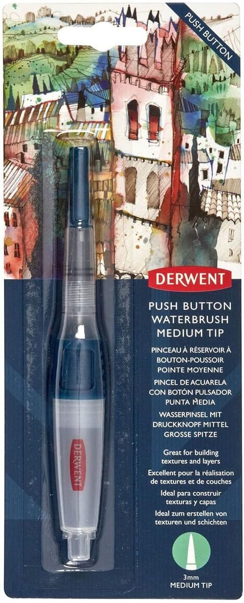 Push Button Waterbrushes feature a large water barrel with push button for easy to control water release. Ideal for use with water soluble paints and pencils. Portable and convenient for indoor and outdoor use. The durable nylon fiber tip holds shape and point for continuous use and comes with a protective cap - comfortable handling and leakproof.