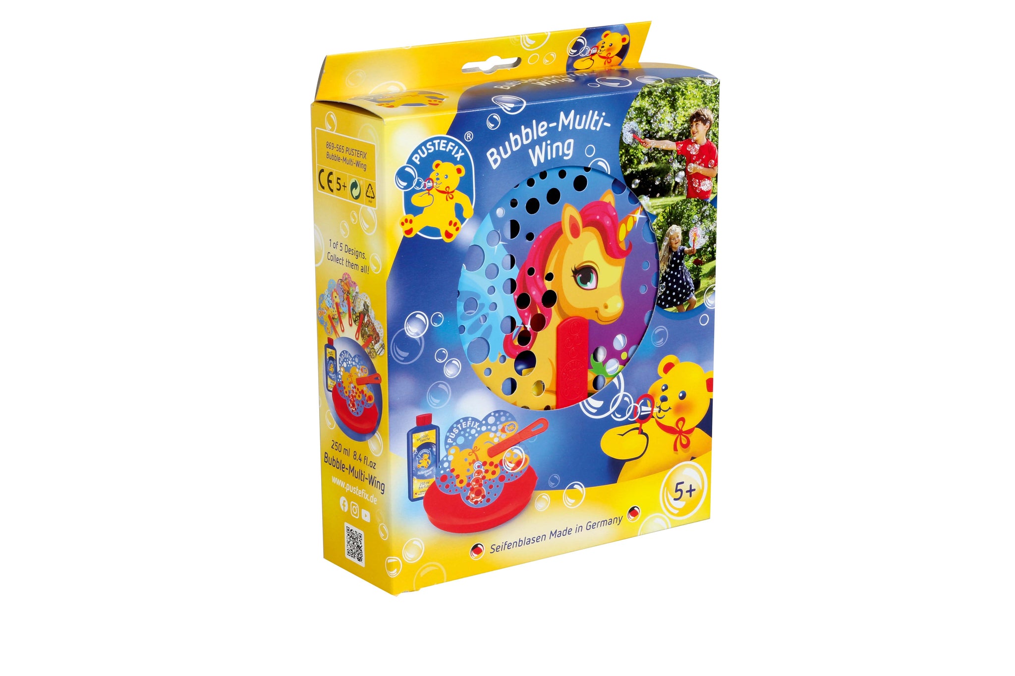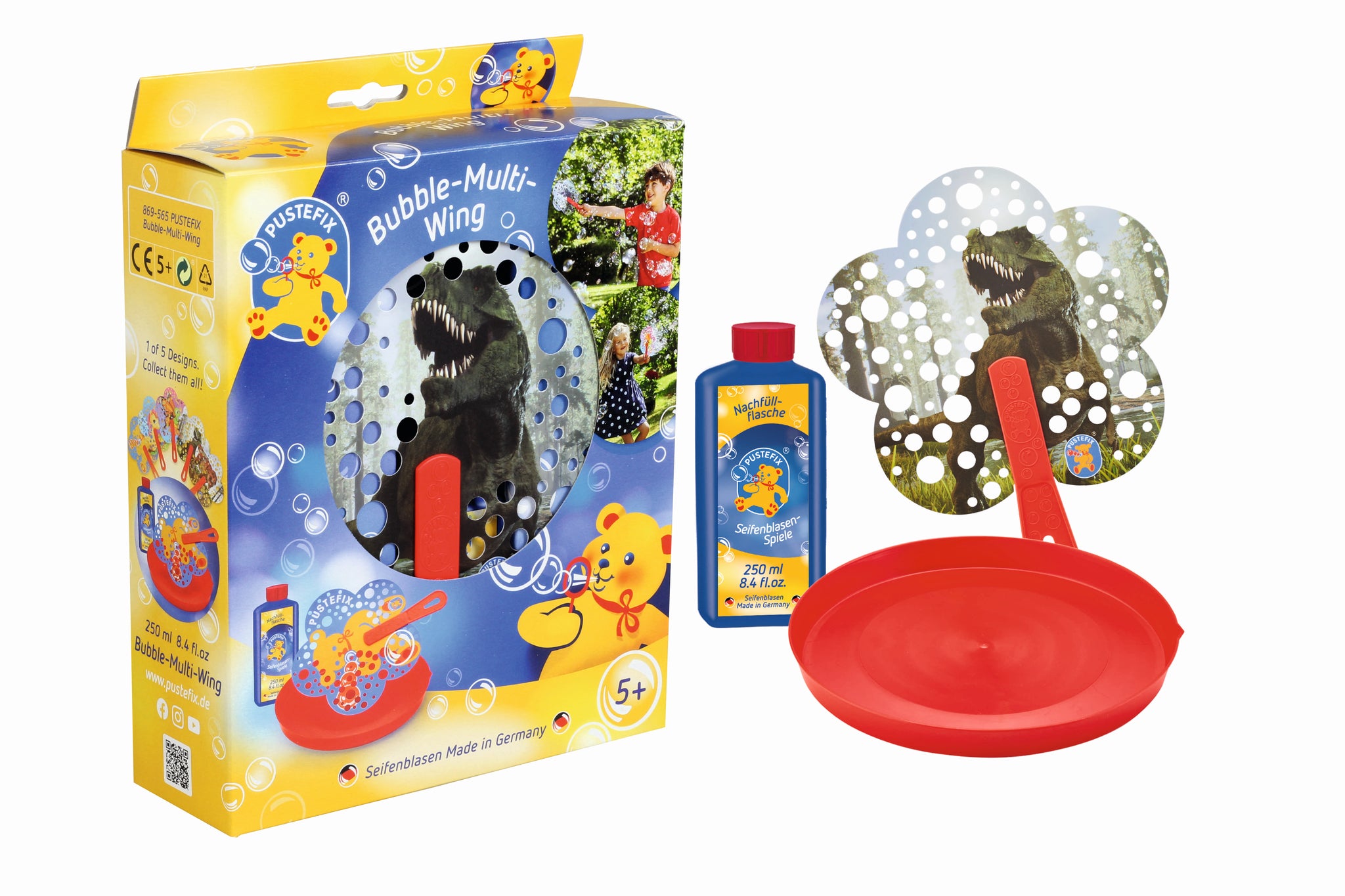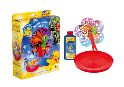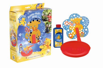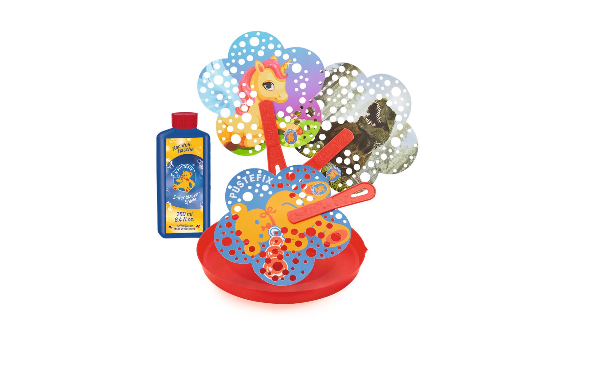 The PUSTEFIX Bubble-Multi-Wing guarantees tons of fun as you enthusiastically wave the fan back and forth. After immersion in the PUSTEFIX soap bubble liquid tray, the liquid film covers the small punched holes in the surfaces of the Bubble-Multi-Wing. Simply wave the fan and, as if by magic, myriad colourful bubbles dance in the air. The pretty, flower-shaped fans are available with three different motifs: PUSTI the bear, a cutesy unicorn, a butterfly and a mighty green or red dinosaur.