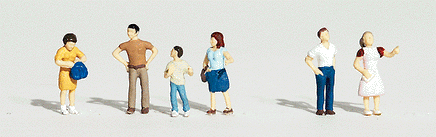 Two men, a boy and three women are included in this set. The boy is pointing to something in a window, while his mother beckons him to come back to her. One man is trying to decide what to buy, while a woman clutches her purse. A woman points to something in the window and the man beside her just looks on, hands in his pockets.