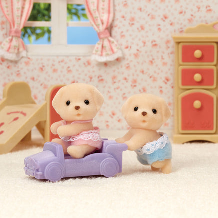 The Yellow Labrador Twins set includes the Yellow Labrador twins figures (one sitting and one crawling) and a ride-on toy. The figures can be posed by moving the head. Yellow Labrador Twins' heads can turn. The sitting Yellow Labrador Twin can fit inside the ride-on toy. Put the crawling Yellow Labrador Twin's hand on the ride-on toy handle to act out play pushing. The crawling Yellow Labrador Twin is a baby boy who loves to blow his toy trumpet when Yellow Labrador Girl plays the piano. The sitting Yellow Labrador Twin is a baby girl who looks up to her older sister, Yellow Labrador Girl. She watches her older sister closely and copies what she does. Use together with Yellow Labrador Family and Yellow Labrador Baby (sold separately) for more delightful fun as a family of seven.