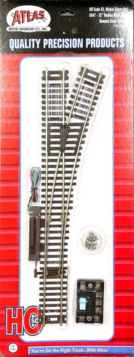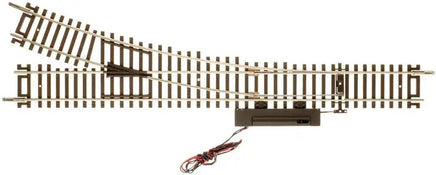 These switches have a remote control switch machine attached so you can wire the switch to be "thrown" (changing the direction of the rail), from your control panel, rather than from the switch itself. Comes with a 1/3 22" radius section, making the curved leg equal to an 22" radius section.
