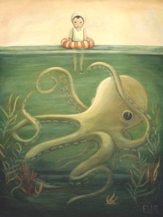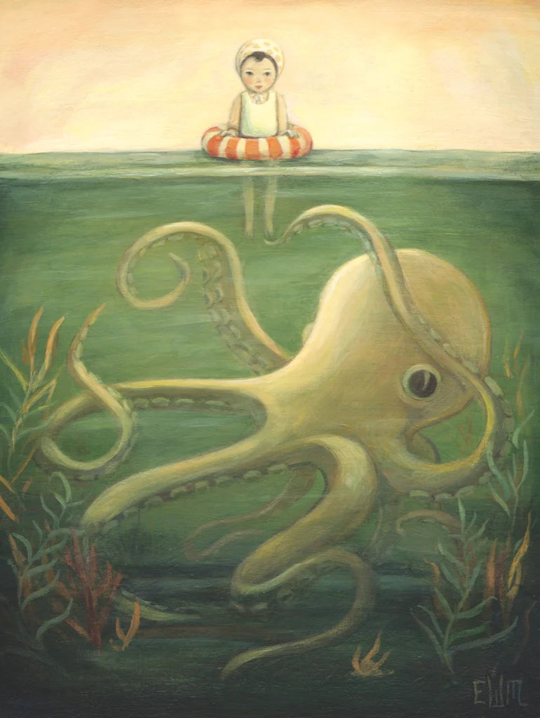 A young swimmer floating on the water's surface is unaware of the eight arms of the monstrous octopus that lurks below.