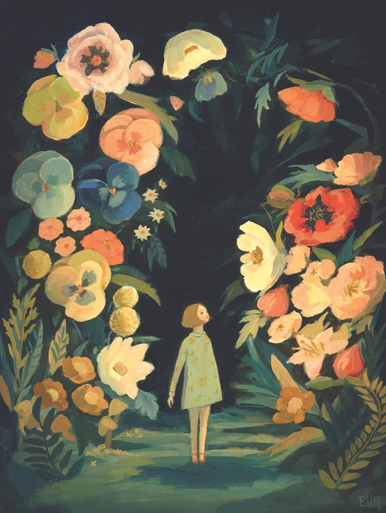 Young girl enjoys a night time walk through an overflowing garden. With colorful flowers larger than herself, this dream like stroll lends a different perspective on these botanical beauties.