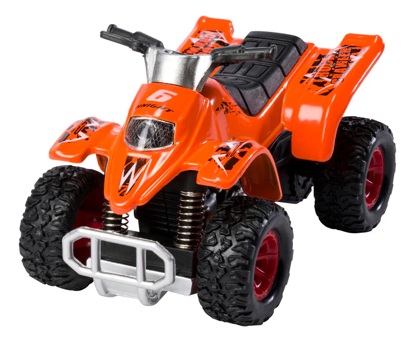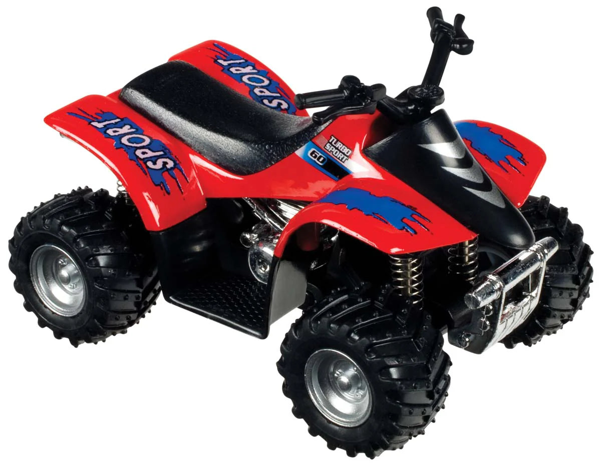 The Smart ATV is a diecast metal pullback toy car that’s realistically detailed for imaginative off-roading play. Measures 3.75 inches. Comes in green, orange, red, and blue color options with exquisite details and designs. Made of high-quality, durable diecast metal and plastic with large rubber tires. An assortment of 8 Smart ATV toys comes with a blue display case.