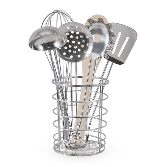 - 7-piece set includes whisk, ladle, spatula, slotted spoon, spaghetti server, wooden spoon, and holder