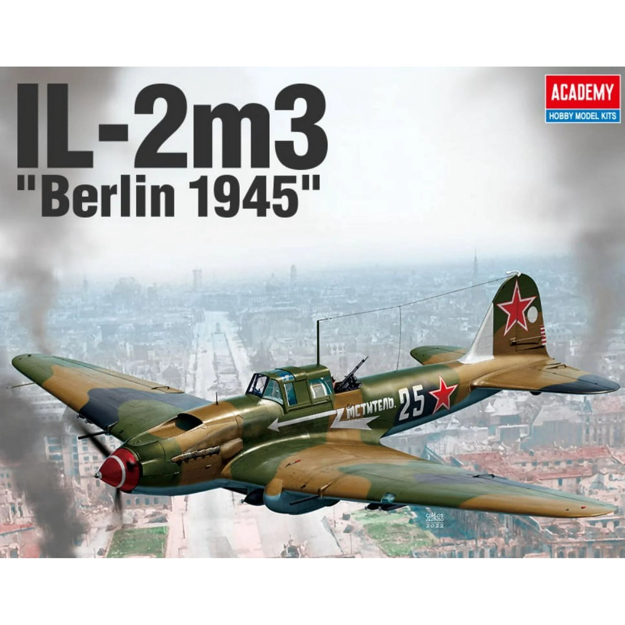 During the Second World War, the Ilyushin Il-2 Shturmovik was the main attack aircraft of the Russian army, and also the most produced military aircraft in the history of aviation, with 36,000 examples produced by the end of the war. The aircraft had integrated armor to protect vital points such as the cockpit, engine, and fuel tank. The single-seat variant of the Il-2 was introduced in March 1941, but after heavy losses, was replaced by the improved two-seat version with a rear gunner. At the end of 1943, a newer version was introduced with the outer wing panels swept back at an angle of 15 degrees to improve the center of gravity. This kit faithfully recreates the IL-2m3 as seen over Berlin in 1945 in 1/48 scale with seven finishing options.