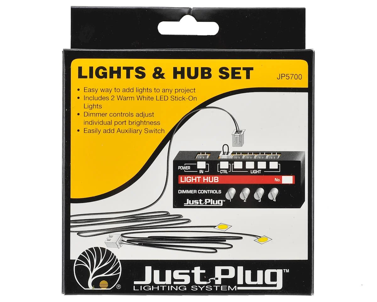 The Woodland Scenics Just Plug Lights/Hub Set is perfect to easily add lights to your layout. All you need is power! This is the quickest and easiest way to add lights to any project. Set includes two warm white LED Stick-On Lights. Use the individual dimmer controls to regulate light brightness. Add an optional Auxiliary Switch for convenient operation. RoHS compliant