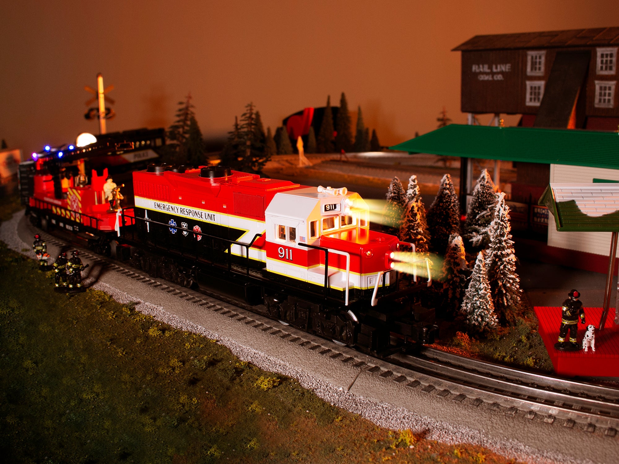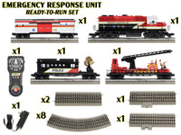 Inspired by the heroic first responders who show up when we need them the most, our Emergency Response set is sure to add some excitement to your railroad. For any scene on your layout where assistance is needed, this beautiful GP38 diesel train will make way with a Fire Rescue car, a Command Unit Boxcar and a Police searchlight caboose ready to take action.