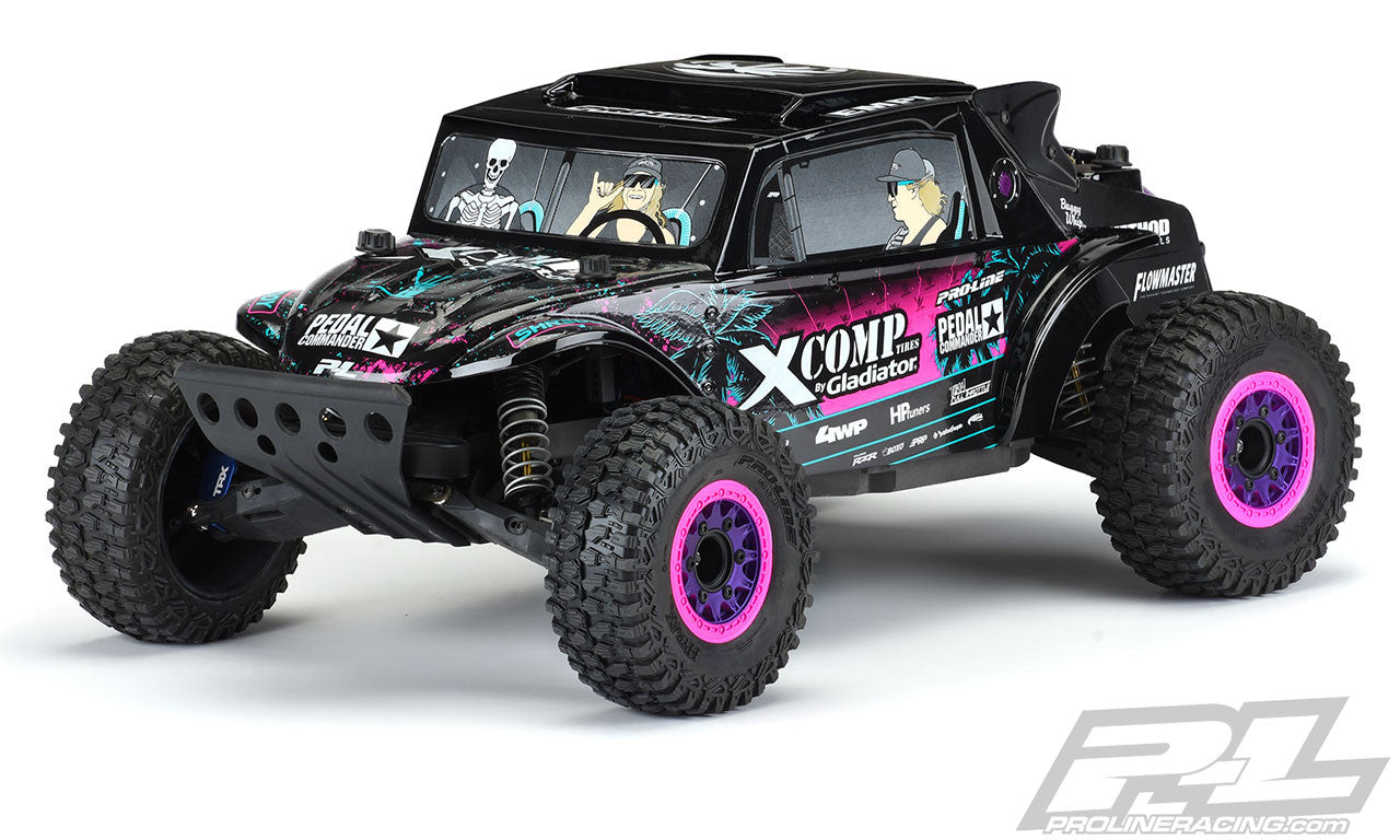 This is a Megalodon Blake Wilkey Edition Desert Buggy Black Body. Pro-Line is proud to collaborate with Shreddy Lyfe's own Blake Wilkey on a re-creation of The Megalodon: a dune-shredding, wheelie-popping, supercharged V8-powered beast of a buggy! You may remember Blake from the infamous Urban Assault video tearing up the streets of San Diego. Now, you can create your own viral videos by transforming your Slash 2wd or Slash 4x4 with this officially-licensed, super scale body! All the details of Blake's beast are captured including molded engine details, roof-mounted air scoop, add-on rear fenders, and shark-inspired side wings.