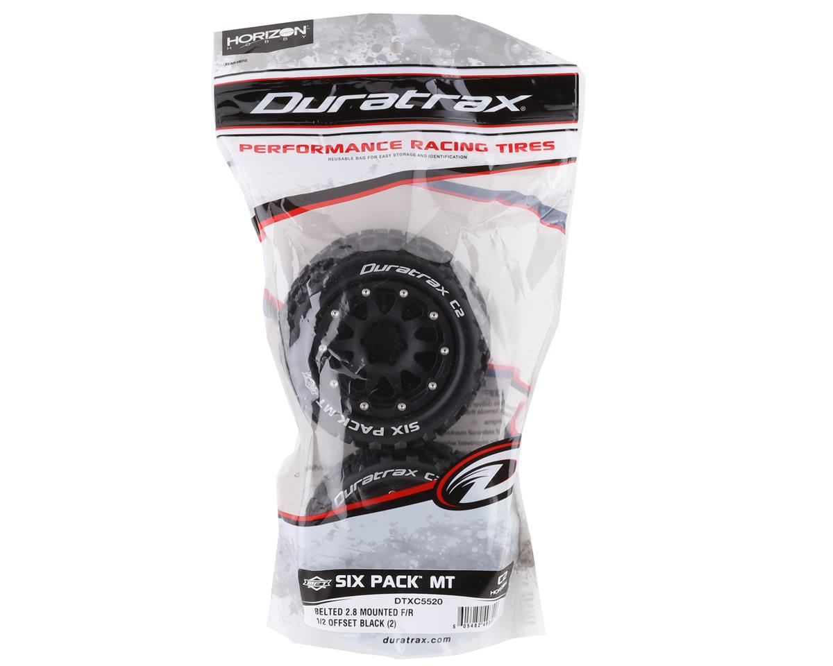 The Duratrax Six Pack MT Belted 2.8" Mounted Rear Tires come ready to be installed. Featuring MFT belts (Micro Fiber Technology) these tires weigh less, balloon less, distort less, and are more durable than ever. MFT not only enhances the durability of the tire but also provides ultimate performance and traction.
