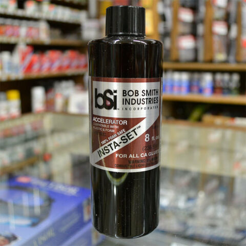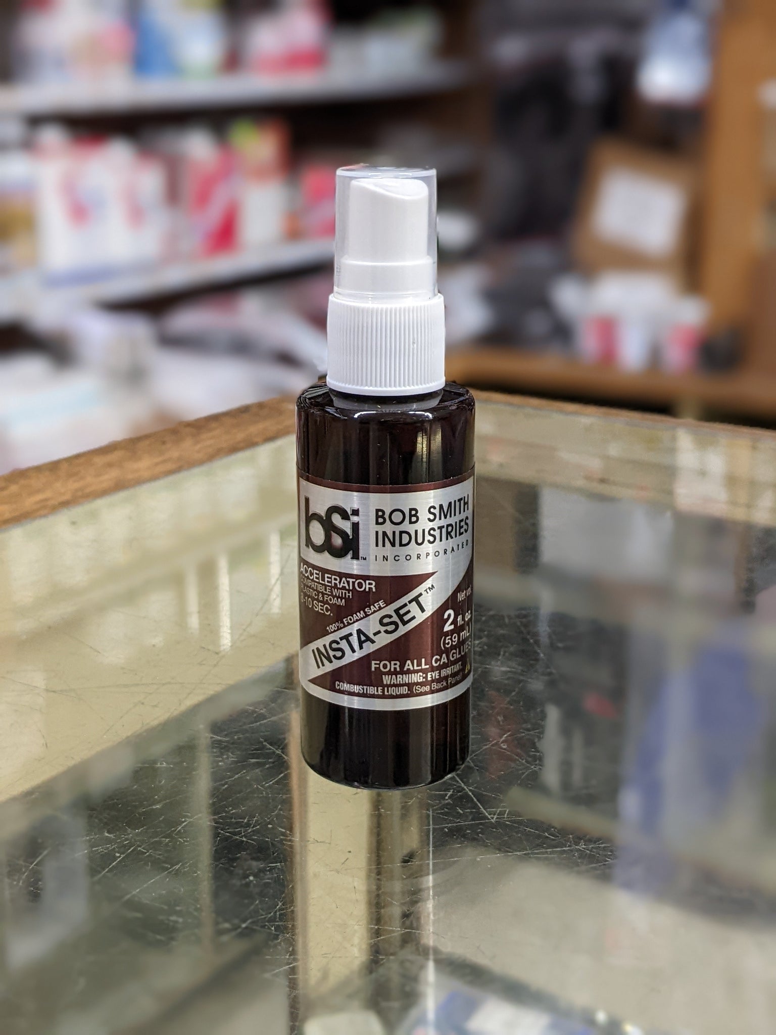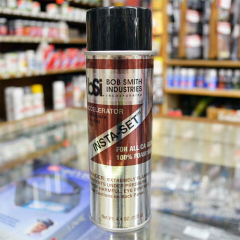 INSTA-SET in a spray bottle is normally used to cure the CA that flows from joints when parts are pressed together. Applying an additional bead of thick CA along a seam and then curing it with INSTA-SET significantly enhances a joint’s strength. For difficult to bond materials, INSTA-SET can be applied to one surface and CA to the opposite surface. When brought together, they will bond instantly. INSTA-SET is formulated with a strawberry scent and activates CA in 6 to 8 seconds without any degrading of the CAs strength, which can occur with many other accelerators. It is compatible with all surfaces, even clear plastic and white foam. Insta- Set Accelerator comes in three variations, a 2 oz. pump spray bottle, and 8 oz. refill bottle, and a 6.75 oz. aerosol can.