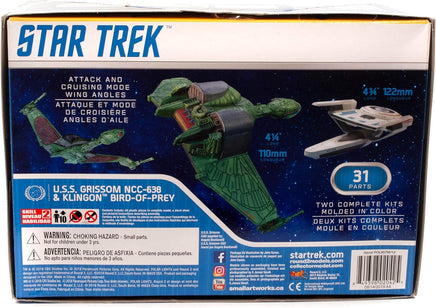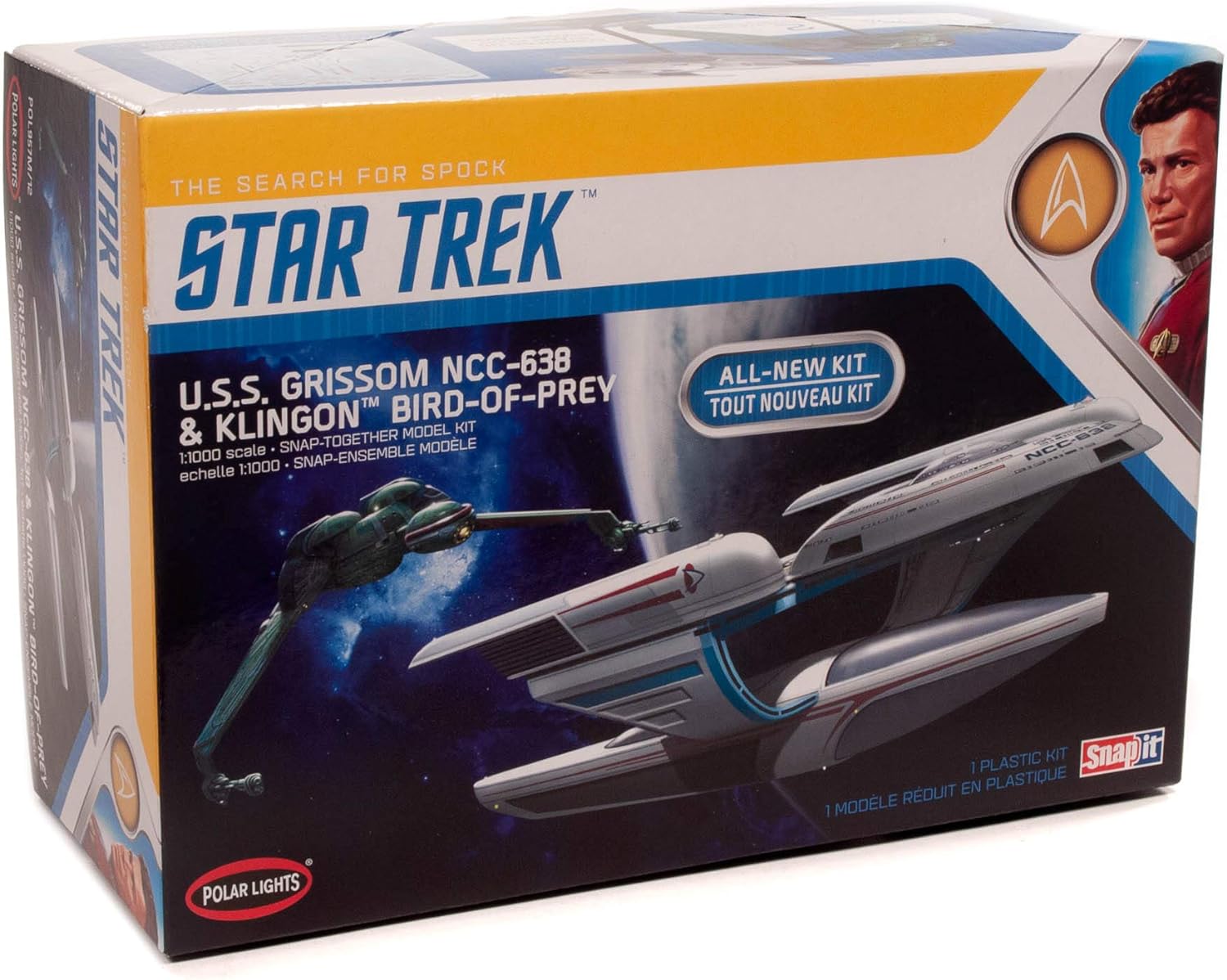 This exciting new kit from Polar Lights features two fan-favorite ships that were first introduced in STAR TREK III: the Search For Spock. The aggressive birdlike stance of the Klingon Bird-of-Prey has long been a favorite of STAR TREK fans and the U.S.S. Grissom appears for the first time in model kit form due to the amount of requests from modelers. The kits are offered in our popular 1:1000 scale and features snap assembly for inexperienced modelers, but they are packed with authentic detail that will satisfy advanced modelers.