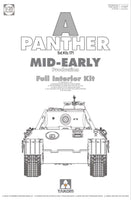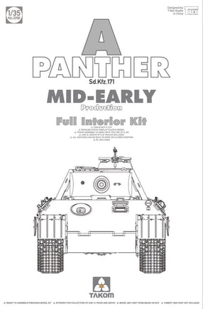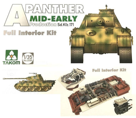 This is a Takom 2098 1:35 WWII German Panther A Mid-Early Tank Interior Plastic Model Kit. Kit contents: Main hatch can be opened/closed, Crawler track is easy to assemble Link & Length with assembly jig, Etching and clear parts, decal included, Completely reconstructed turrets, fighting rooms, engine rooms, etc.