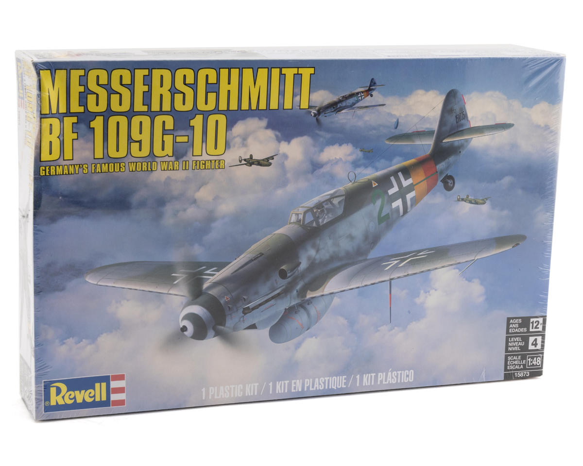 Revell 1/48 Messerschmitt Me-109G Plastic Model Kit. First flown in 1935, the Bf 109 became one of the most renowned Axis fighter planes in wartime aviation history, with over 33,000 units produced by the end of World War II. The G-10 variant, developed late in the war, featured a powerful 1,475 HP supercharged engine and enhanced protective armor plating. Revell's model kit includes a movable propeller, a long-range fuel tank, a detailed cockpit, optional position landing gear, and authentic G-10 decal markings for one Luftwaffe version.