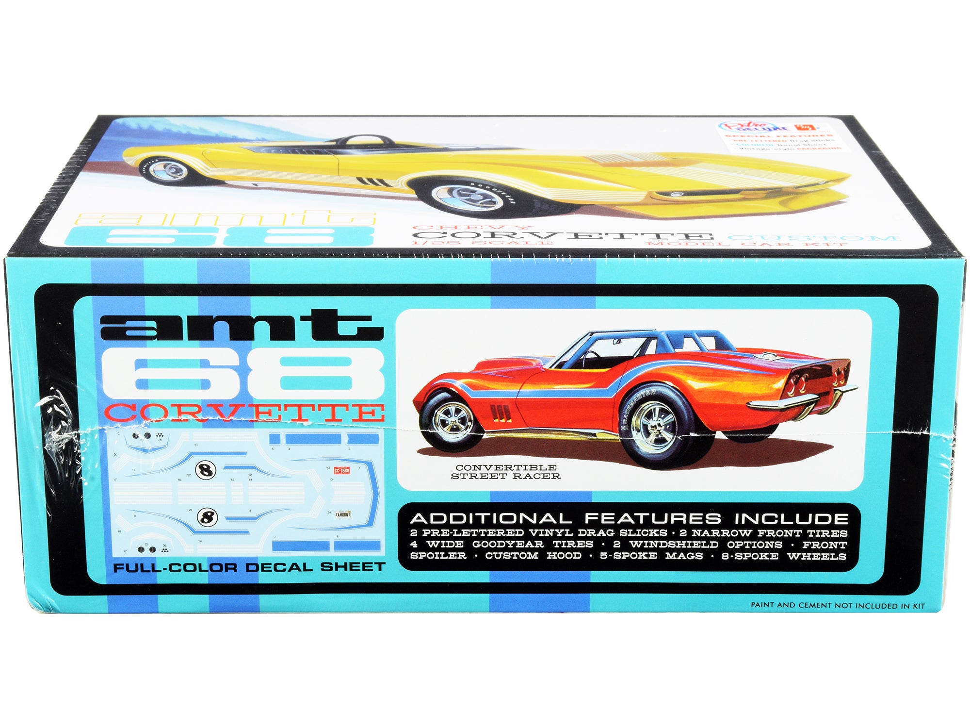 The 1968 Chevy Corvette Custom kit features details like pad-printed drag slicks, 2 tire options, front spoiler, 2 windshield options, custom hood, 5-spoke Mags, 8-spoke wheels, rollcage, 3+ engine configurations and lots more customizing parts. Kit also includes ALL NEW decals with lots of option and vintage style Retro Deluxe AMT packaging.