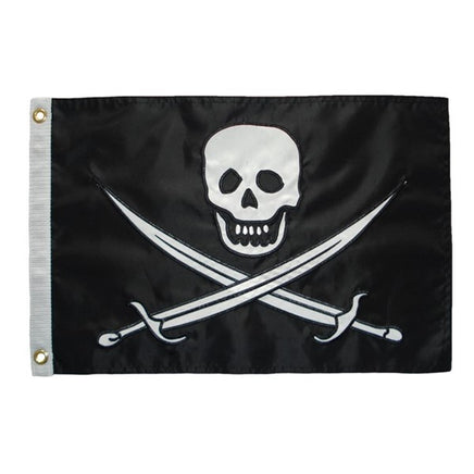 This fun and bold Calico Jack grommet flag are great for a party atmosphere or year-round decor. The two-layered, applique construction allows for the skull and sword to appear identical on both sides of the flag.