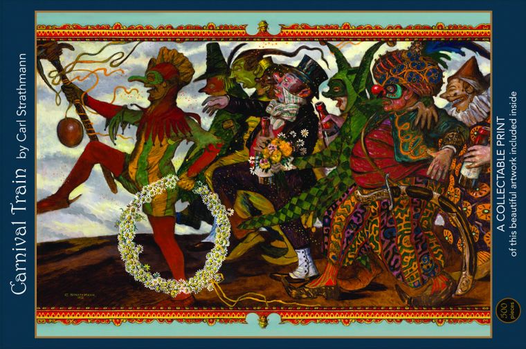 500-piece puzzle, Carnival Train, features a fun and quirky painting by German Artist, Carl Strathmann. Strathmann was an Art Nouveau painter whose ornate style was applied to fairy-tale caricature figures, creating beautifully intricate designs bordering on the fantastical.