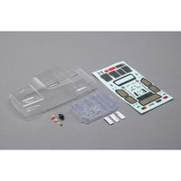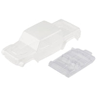 Axial SCX24 Jeep JT Gladiator Body Set. Package includes optional clear body, interior pan, driver head, and decal sheet.