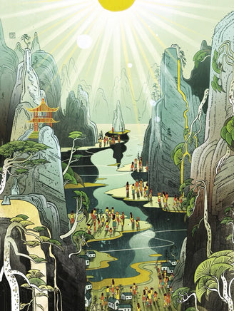 In the countryside of China, people move about alongside the mountains and take in the serene scene.