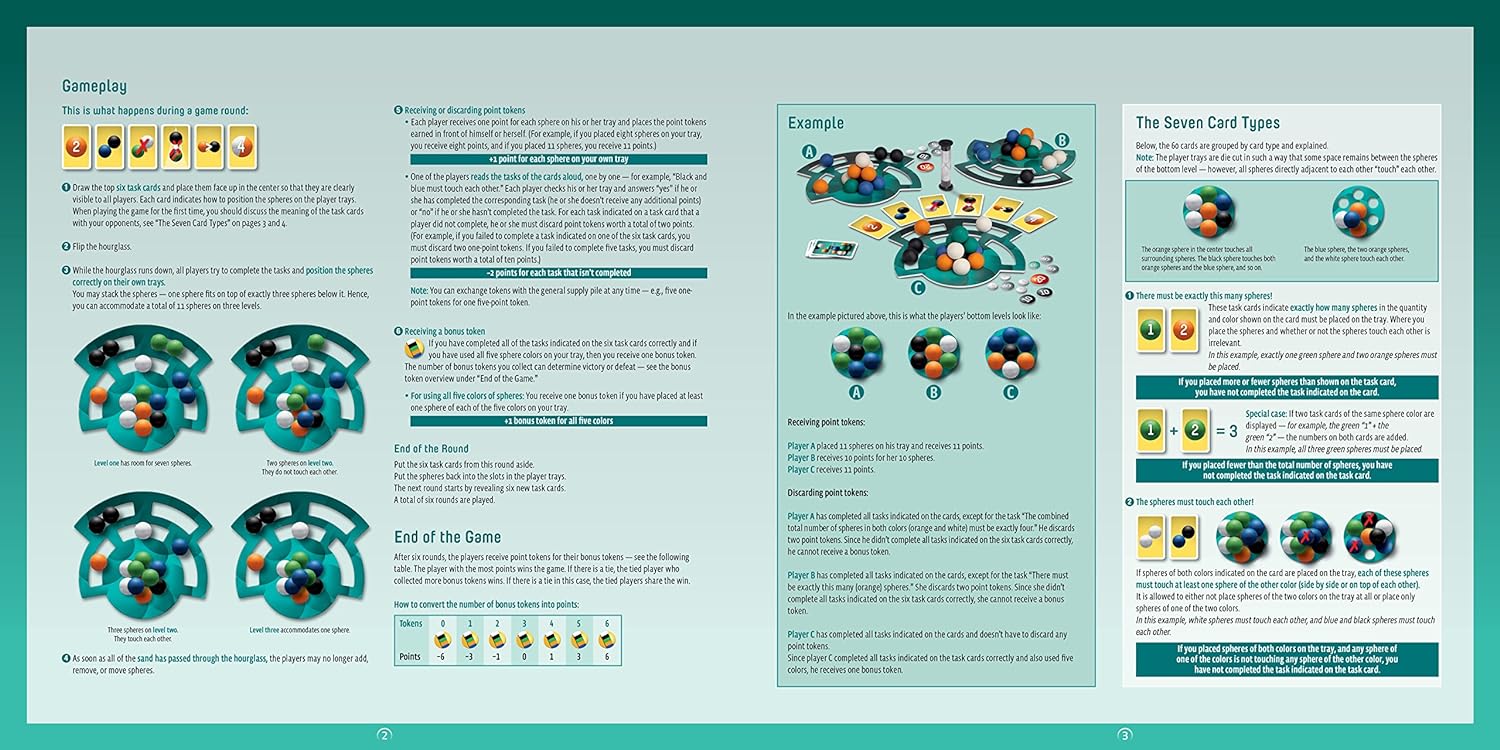 Complete these tasks while racing against the timer. You get a point for each sphere you use and a bonus token for using all five colors, but you lose two points for each task card you don't follow correctly. Prove to your opponents that you are the master of multi-dimensional thinking!.