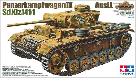 From the beginning and through to the middle stages of WWII, the Pz.Kpfw.IIIs along with the Pz.Kpfw.Ivs were the core tanks used by German tank divisions. Each variant of the Pz.Kpfw.III including the Ausf.L was highly reliable, came armed with a long barreled 60 caliber 50mm gun and had reinforced armor. This is a 1/35 scale plastic assembly model kit of one such Ausf.L tank. Famous characteristics of the Ausf.L which include the driver's front panel and main gun mantlet have been realistically reproduced. The fighting compartment loading area, turret interior, and commander’s seat have been reproduced. You can also choose to assemble each hatch in either open or closed positions. Accessory parts seen on the hull such as spare tracks and tools feature a precise finish. A tank commander figure is included.