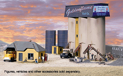 Walthers Cornerstone #: 933-3087 Scalehouse/Office: 4-3/4 x 2-7/8 x 2-1/8" 11.8 x 7.1 x 5.3cm Storage Bins: 8-7/8 x 3-1/2 x 7-3/8" 22.1 x 8.7 x 10.9cm Oil Tanks (2): 1-5/16" Diameter x 3-5/8" 3.3cm Diameter x 9.2cm Pump House: 1-1/4 x 1 x 1-3/8" 3 .2 x 2.5 x 3.5cm Shoehorned alongside mainlines and sidings, the local fuel dealer was well known to everyone in town. Coal for home heating, as well as commercial accounts like small factories and stores, could by bought by the bag-full or the ton and delivered to your house. As oil furnaces became common, many dealers expanded their line to include home heating oil too. Whether in a big city scene or a quiet country town, this kit looks great next to the tracks of your HO Scale railroad. The model is complete with detailed "concrete" storage silos, a small office with attached scale platform area, oil tanks, truck filling rack, coal conveyor, hopper unloader and fencing to build a complete scene. And like the prototypes, the buildings are easily arranged to fit in odd-shaped spaces. Typical of facilities commonly seen in the US from the 1920s to the 1960s, it can be built as a free-standing business. Many fuel dealerships were often operated by the local lumber yard or grain elevator, opening additional industrial ideas for using other Walthers kits and accessories.