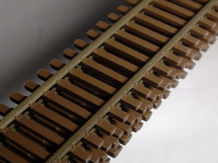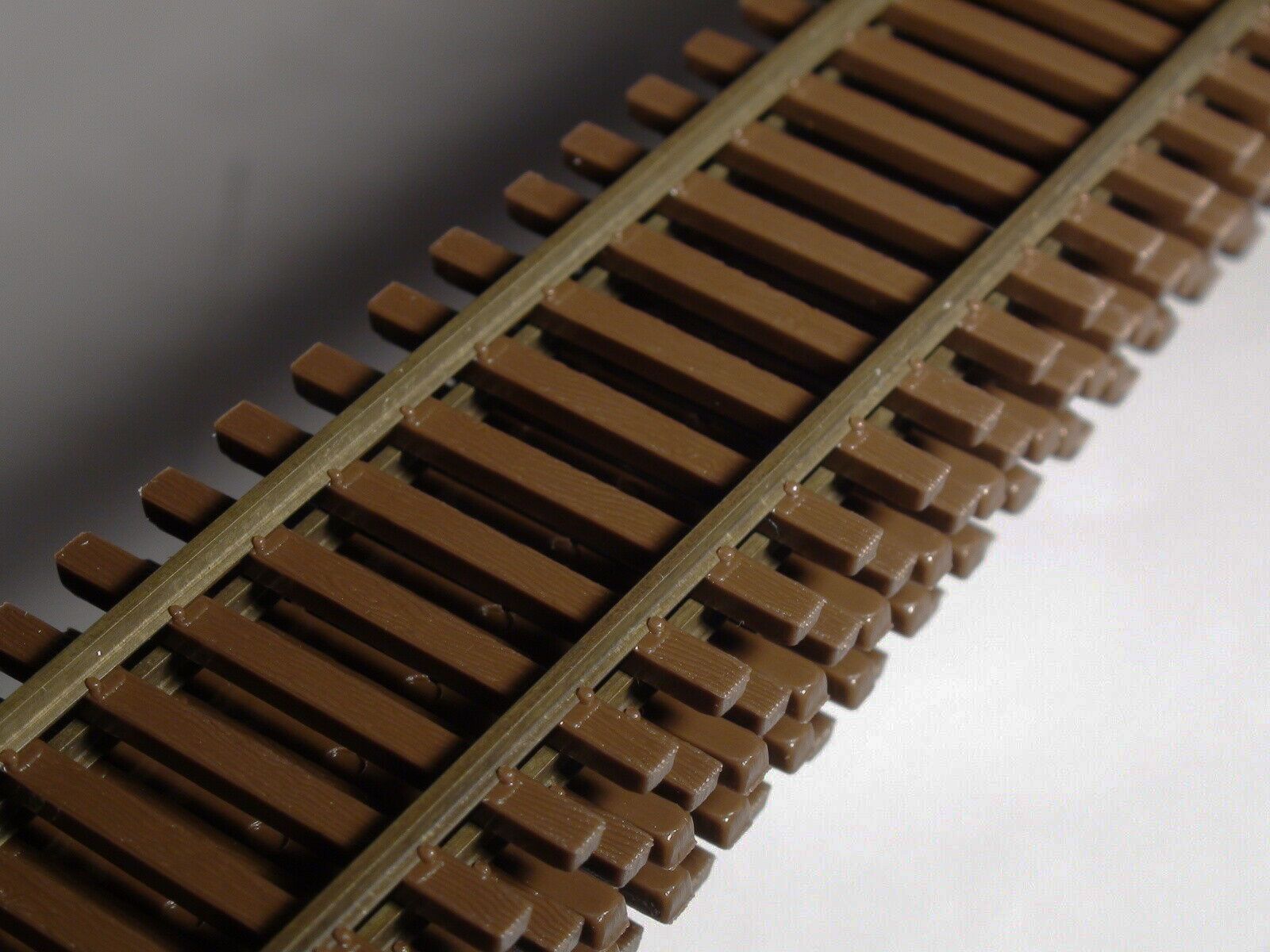 Flex-Trak(TM) features scale-size ties, tie plates and spikes, irregular tie spacing, Brown color and nickel silver rail. 3' lengths.