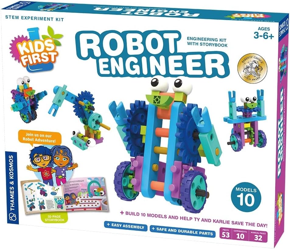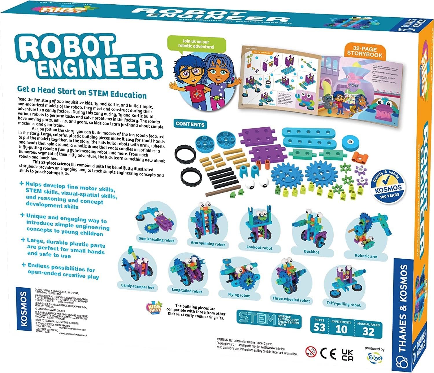 From each humorous segment of their silly adventure, the kids learn something new about robots and machines. This 53-piece science kit combined with the beautifully illustrated storybook provides an engaging way to teach simple engineering concepts to preschool-age kids. Start laying the groundwork for strong STEM-related skills and comprehension. This kit helps develop fine motor skills, science and math skills, visual-spatial skills, and reasoning and concept development skills.