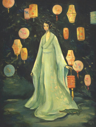 Surrounded by the illuminated lanterns, the nights darkness emphasizes the ethereal glow of the enchantress of the garden. With a wary gator by her side, her flowing gown and porcelain skin add to an aura of mystery.