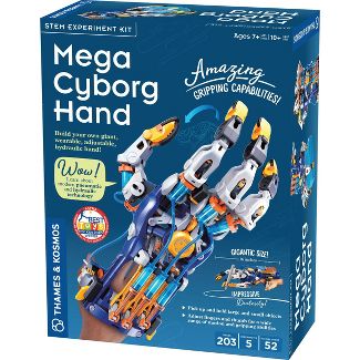 Once assembled, your cyborg hand slips onto your own hand like a glove, with mechanical fingers that you operate with your own fingers and that can grip objects with enough force to lift them. Challenge yourself to pick up and hold a variety of items like bottles, pencils, small items--anything within reach!