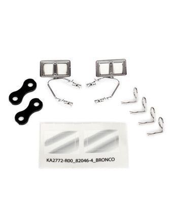 These are the Chrome Side Mirrors (left & right) for the Traxxas TRX-4 Ford Bronco. Includes 2 retainers / 4 body clips .