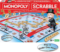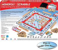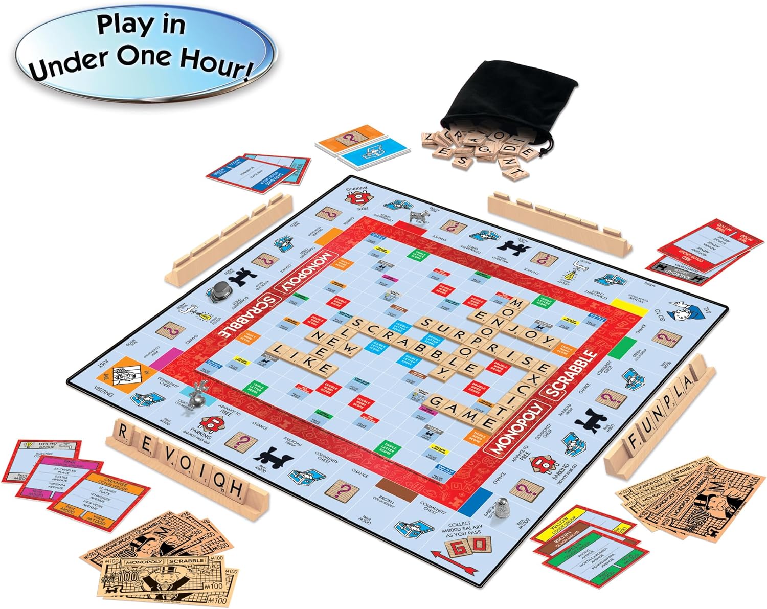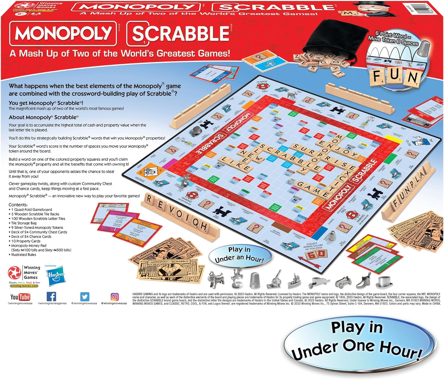 Monopoly® Scrabble® Experience the totally unique gameplay of Monopoly® Scrabble®— the innovative game that combines the best elements of the Monopoly® game with the crossword-building play of Scrabble®. In place of rolling dice to move around the board, players build words and move ahead by their score. Build a word on a premium space and claim a Monopoly® property.