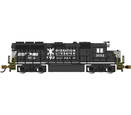 EMD GP40 Diesel Locomotive - NORFOLK SOUTHERN OPERATION LIFESAVER #3053 (with dynamic brakes) - N Scale. The EMD GP40 diesel locomotive was built by General Motors Electro-Motive Division between November 1965 and December 1971. Powered by an EMD 645E3 16-cylinder engine which generated 3000 horsepower the GP40 has proven itself as a standard freight engine on railroads throughout North America. This Bachmann model features a highly detailed body, operating directional dimming (Rule 17) headlights, All-wheel electrical pickup and drive, Skew wound motor with bronze bearings, Die-cast chassis, and Performs best on 11.25" radius curves or greater.