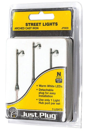 Use to light city streets, sidewalks, downtown areas, parks, bridges and more. So realistic you will think it is actually made of cast iron! All Just Plug Lights are compatible with the Just Plug Linker Plug N scale dimensions 0.417 in w x 1.874 in h (10.6 mm w x 47.6 mm h) 3 Warm White LED Street Lights with 36 in (91.4 cm) wire from base of light to the Linker Plug.
