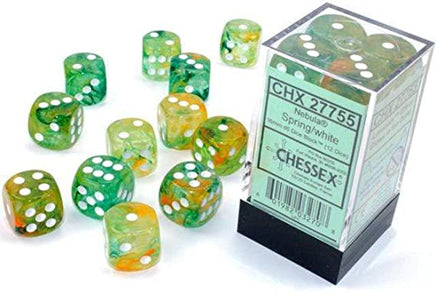 Nebula: Spring/ White Luminary 16mm D6 Block Dice Set (12) in a acrylic block for safe storage.