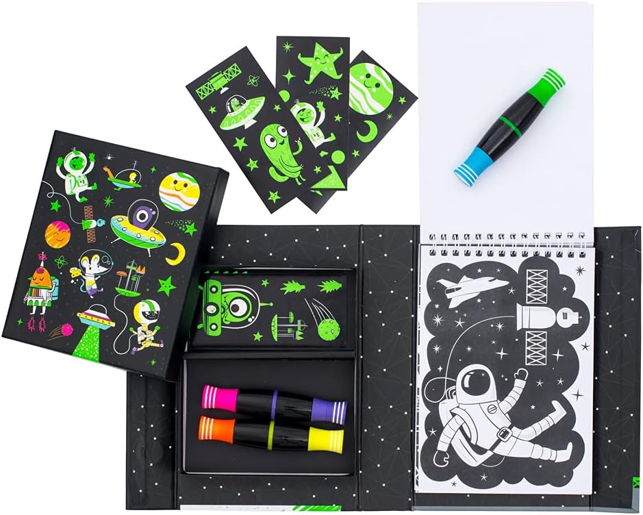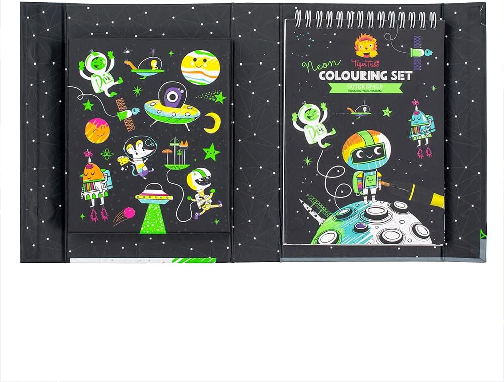 Bright, bold and beautiful, the Neon Coloring sets from Tiger Tribe. Create incredibly dramatic artwork that literally pops right the page. Unicorns, Space ships and curious creatures all come alive with these self-contained coloring kits. Each has a 36-page spiral-bound, beautifully decorated coloring book, 3 double tipped neon colored markets and 5 neon sticker sheets.
