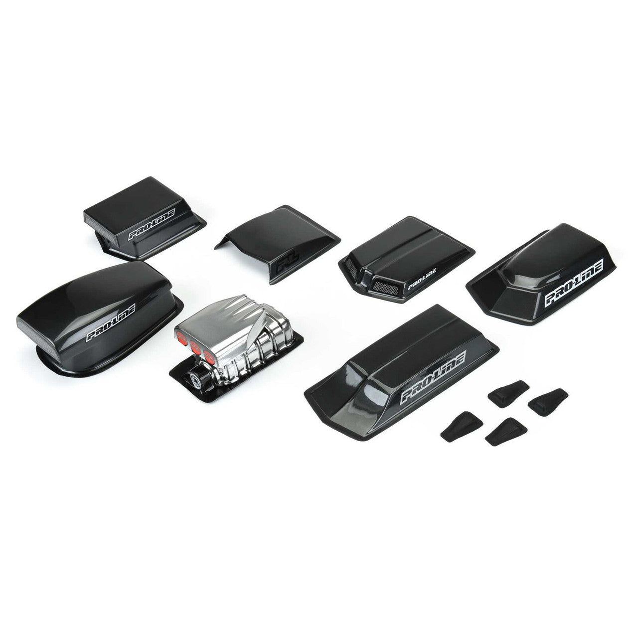 The Pro-Line Hood Scoops & Blowers No Prep Drag Racing Variety Pack can be painted and customized to perfectly match your car! The pack includes a two-piece scale intake and blower that will transform your car into a full-on American Muscle. The included Pro Stock and Pro Mod style hood scoops and cowls are perfect for recreating a more serious drag racer look. Pro-Line even includes scale Naca ducts that can be placed in the windows or anywhere you want for an incredibly unique and ultra-scale appearance. These scale accessories are perfect for many of Pro-Line's popular Drag bodies but can be made to fit almost any 1:10 or 1:8 scale bodies.