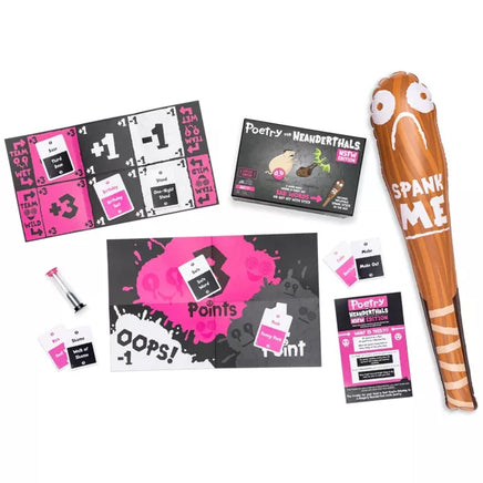 Poetry for Neanderthals: NSFW Edition is an adult party game similar to Taboo where players earn points by getting their teammates to guess words and phrases. The catch is that the “Neanderthal Poets” are only allowed to use single syllable words. If they use any words with more than one syllable, the other team gets to spank them with the 2-foot inflatable Spank Stick.