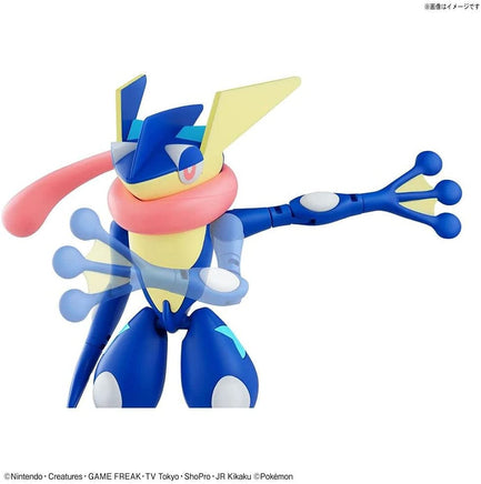 Greninja is the latest addition to the Pokémon Plastic Model Collection! This collection strikes a balance between ease of assembly, color separation, and articulation! Various poses are possible with the articulation of the arms and legs. Two types of effect parts are included in clear molding. Additional leg part that's different from the standing pose included.