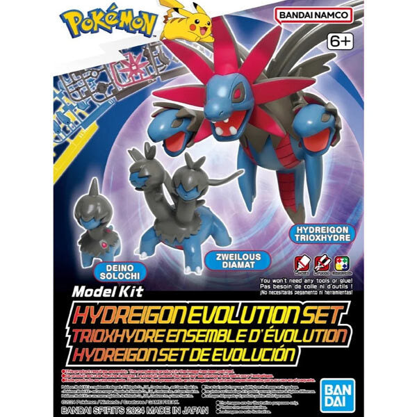 This simple snap-fit plastic kit set allows modelers to build Pikachu and three evolution forms of Hydreigon (or Sazandora, as it's known in Japan), consisting of Monozu, Jiheddo, and a slightly articulated Hydreigon/Sazandora. Move Hydreigon's head to simultaneously move its arms! All parts come molded in color and a sheet of stickers is provided for detail so no painting is required.