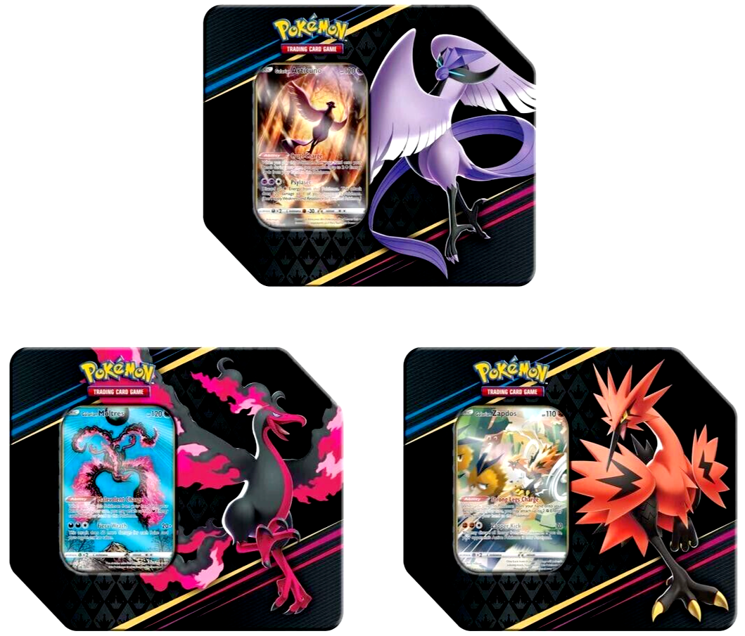 Three fearsome Legendary Pokémon have arrived from the Galar region! With their own unique type and powers, they’re forces to be reckoned with. Add this power to your Pokémon TCG collection and see for yourself! Will you choose the atrocious attitude of Galarian Articuno, the zippy zeal of Galarian Zapdos, or the malevolent malice of Galarian Moltres? Regardless of your choice, you’ll also find 5 booster packs from the special Pokémon TCG: Crown Zenith expansion and a code card for Pokémon TCG Live!