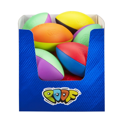 The multi-colored football has a soft and durable foam exterior for tons of fun outside in the yard, the pool or indoors. The ball's design provides a spiral every time and is great for playing a fast paced, high-action game or just to help develop your child's catching and throwing skills. POOF foam balls have become the preferred choice by teachers for their students during indoor and outdoor school sport activities.