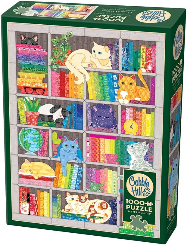 Cozy kitties and colorful cats! This is the perfect quilt to cuddle up with, and oddly enough, the puzzle is the same way! Enjoy some time with our quilted feline friends in this heart-warming 1000 piece puzzle!