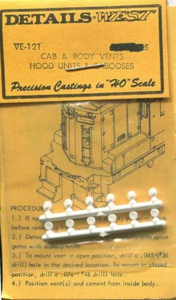 This is a Details West 121 Cab and body vents, round. Styrene, is used on hood units and cabooses.