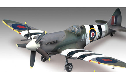 This is the Academy 1/48 scale plastic model of the Spitfire Mk XIVc. The Supermarine Spitfire Mk.XIV was one of the best, if not the best, British fighter of WWII. It was developed to take advantage of the new Rolls Royce Griffon engine, around 80 mph faster than the Merlin engine used in the earlier versions. Due to its great speed, it was one of the natural choices to confront German V1 jet flying bombs.