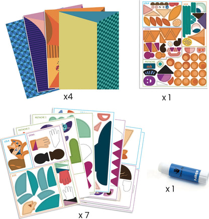 - The kit comes complete with 4 art boards, 7 paper sheets, a sticker sheet and a glue stick.