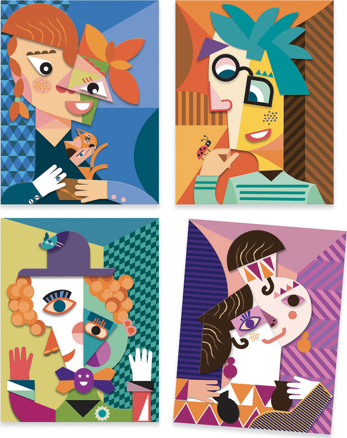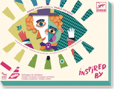 - A sticker collage kit that explores the work of Pablo Picasso and Cubism; attach paper designs with the glue stick and add stickers to create a 3-dimensional work of contemporary art.