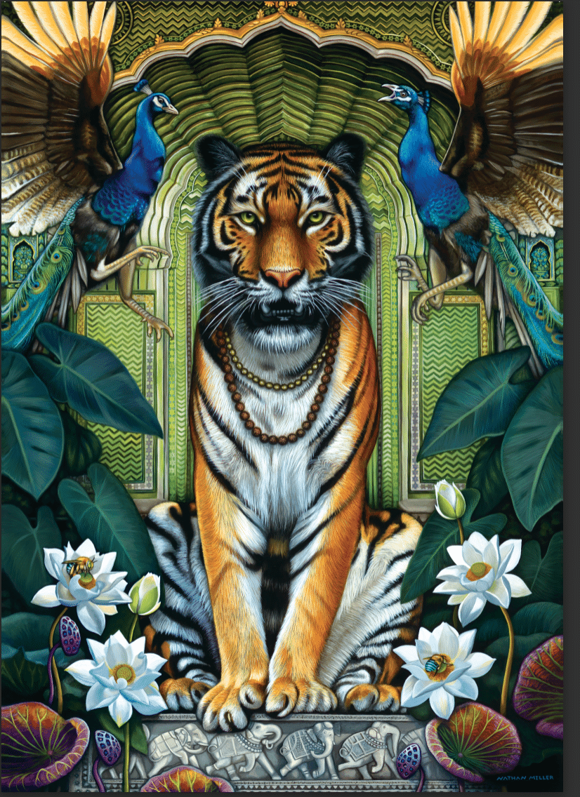 Fine art wildlife painter Nathan Miller gathers inspiration for his art from many years spent abroad in Costa Rica. He developed as an artist in the small town of Nosara where, surrounded by the jungle and immersed in nature, his creativity was awakened and the desire to portray wildlife in his work commenced. Commissioned paintings of wildlife and portraiture led to exhibiting his art at the Hidden Garden Gallery in Liberia, Costa Rica. In The Legend of the Jaguar Shaman, the Jaguar — a venerated animal through Latin American traditions — is celebrated. Miller incorporates several other iconic motifs of pre-Columbian civilizations in his art, paying homage to Costa Rica’s natural beauty and rich traditions.