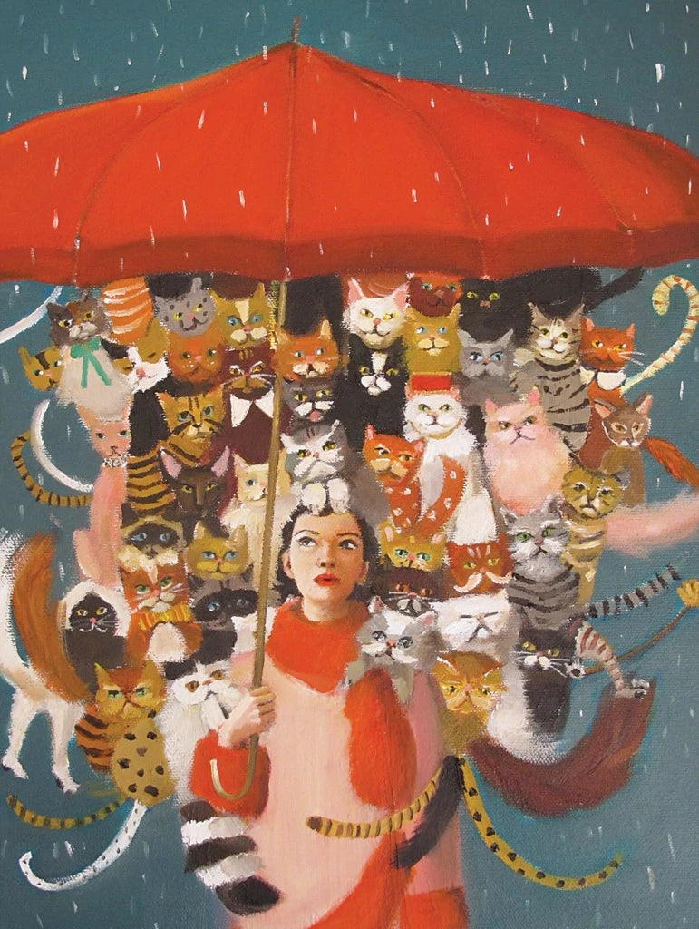 These cats won't let a few raindrops spoil their day as they take a trip outside with Miss Mink neatly under her umbrella.